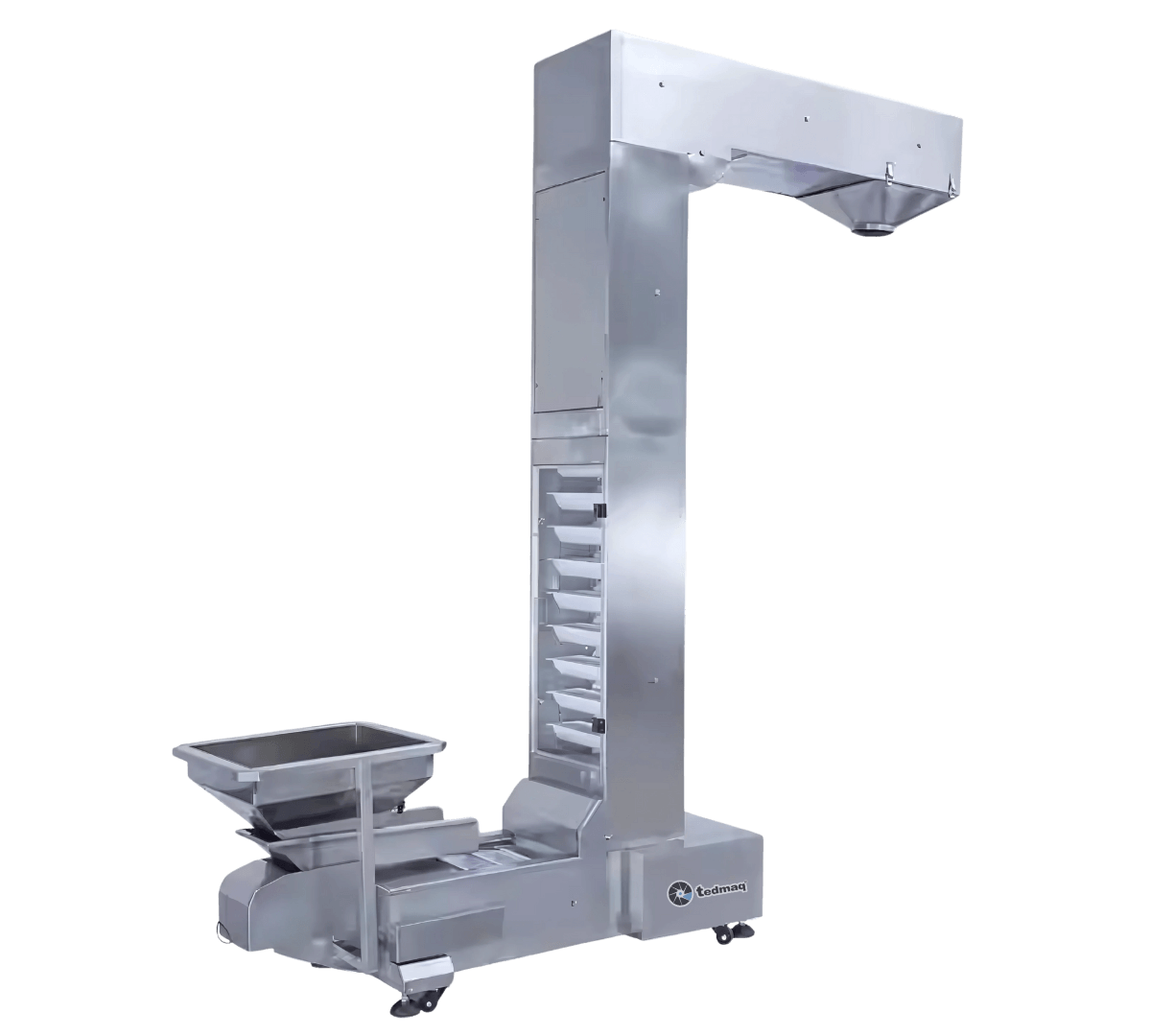 El Elevador Tipo Z es un sistema diseñado para elevar materiales de forma vertical, especialmente útil en procesos que requieren transportar productos desde un punto de carga bajo hasta una altura mayor para alimentar otras máquinas como dosificadoras, empacadoras o tolvas intermedias.