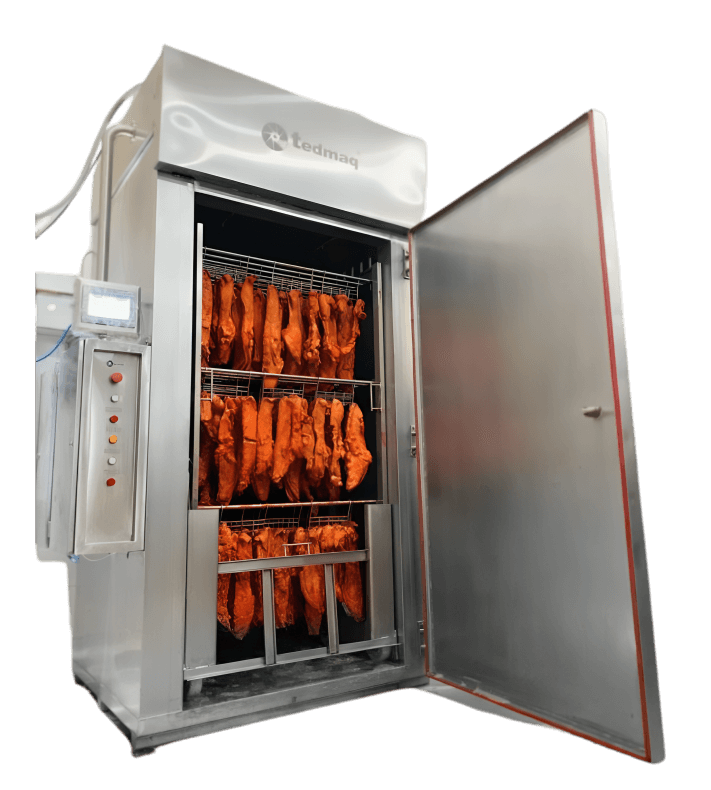 Los Hornos de Cocción Automáticos TEDMAQ ofrecen la máxima calidad y versatilidad en el procesamiento de alimentos, integrando cocción, ahumado, secado y choque térmico en un solo equipo. Su diseño multifuncional permite adaptarse a diferentes recetas, garantizando productos de alta calidad y uniformidad en sabor, textura y apariencia.