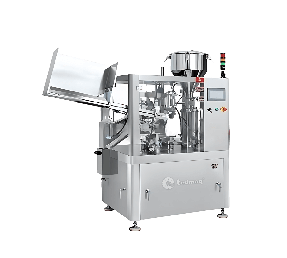 La máquinas Llenadora de Tubos Colapsibles de Plástico con Posicionador Élite TEDMAQ es un equipo de alta tecnología diseñado para el llenado y sellado automático de tubos plásticos, laminados y metálicos. Con un sistema rotativo de 8 estaciones, esta máquina garantiza máxima eficiencia en cada ciclo de producción, integrando de manera automática los procesos de alimentación de tubos, posicionamiento, llenado, sellado, codificación y descarga del producto terminado.