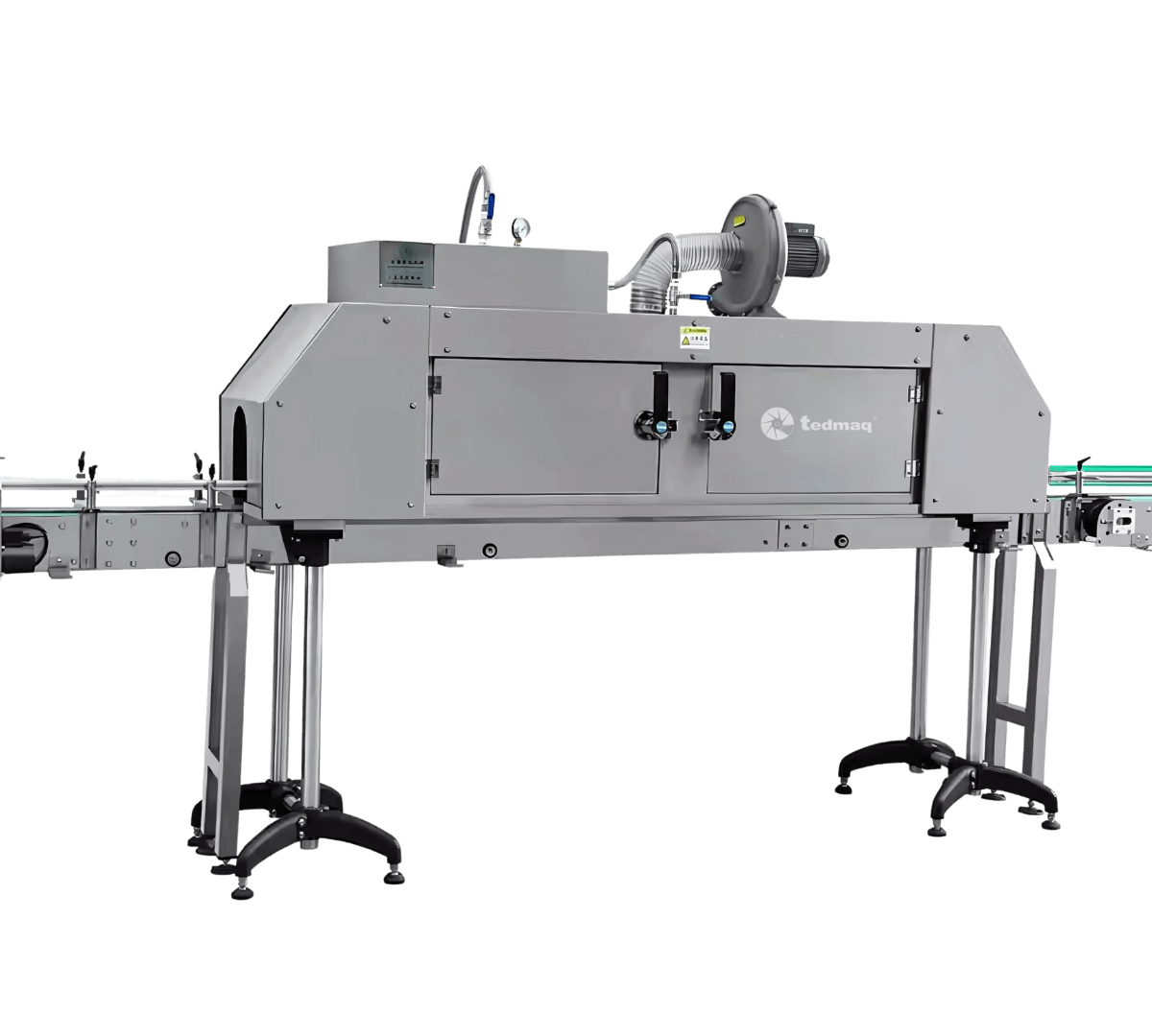 Este sistema incorpora temporizadores y controles avanzados, permitiendo ajustar fácilmente los parámetros según el tipo de producto, garantizando un termoencogido óptimo sin afectar la calidad del contenido. Su tecnología de aplicación a vapor permite un encogimiento más uniforme y de mejor apariencia, ideal para productos con fundas en PVC.