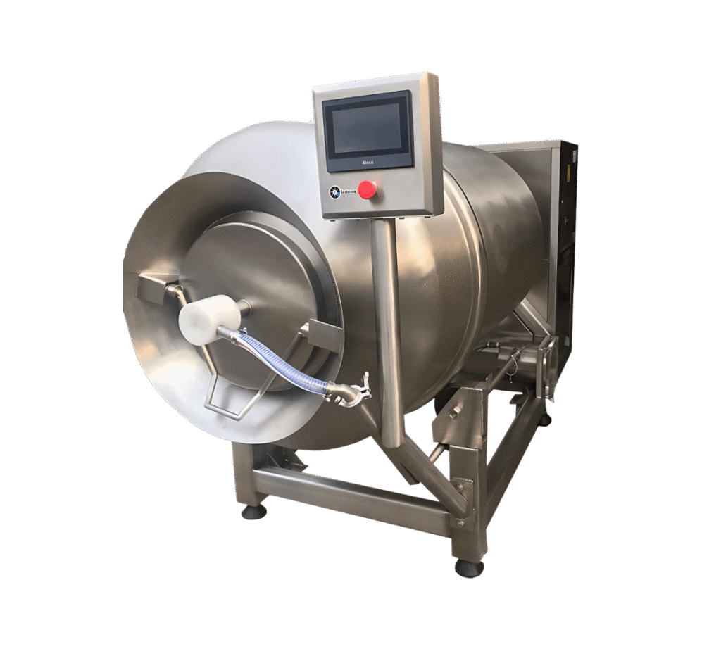 Un tombler es una máquina utilizada principalmente en la industria cárnica y alimentaria para mejorar la absorción de ingredientes, la textura y la jugosidad de los productos a través de un proceso de masajeado controlado. Funciona generando un vacío parcial y movimientos rotacionales que permiten que la carne absorba salmuera, especias y otros ingredientes de manera uniforme, mejorando la estructura y evitando pérdidas de líquidos durante la cocción. Su uso es esencial en la producción de embutidos, jamones, carnes marinadas y productos listos para cocinar, asegurando un producto final más tierno, jugoso y con mejor sabor.
